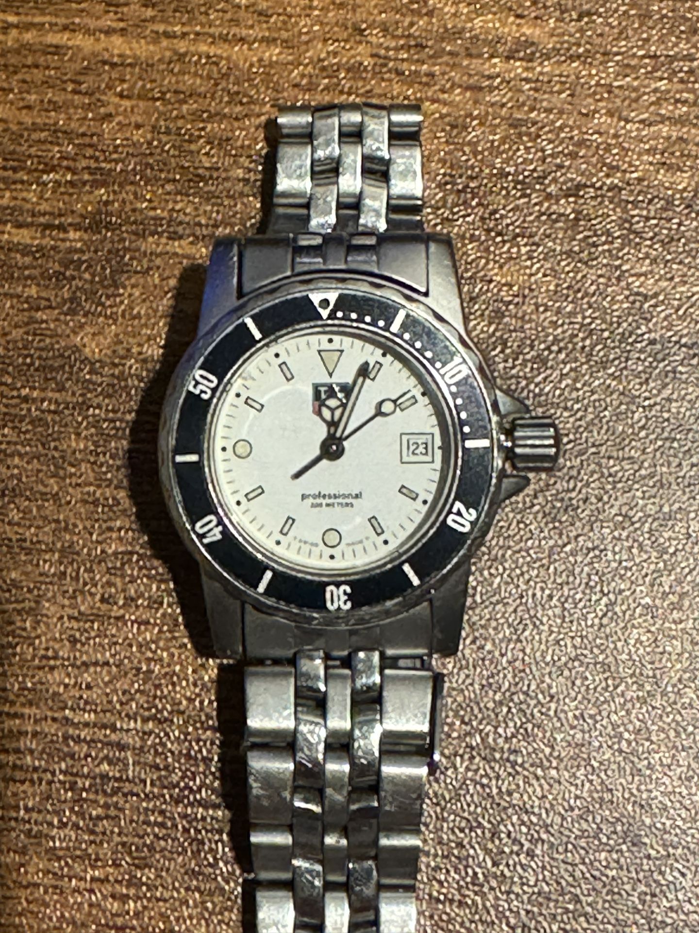 White face, black dial. Women’s watch. Has scuffs and scratches from regular wear. Needs battery.