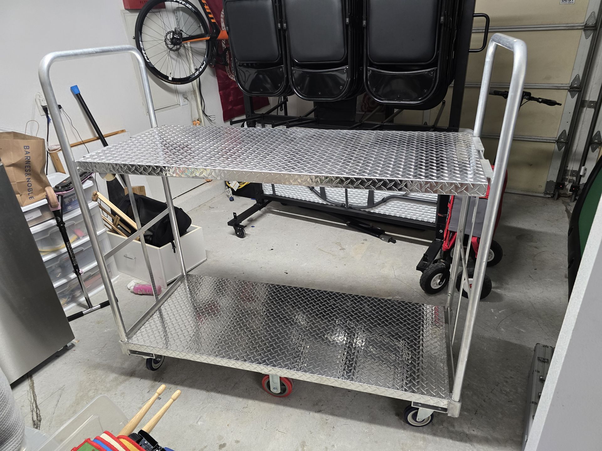 63" x 24" First shelf is 10" off ground, second is 46", and bars are 61". Great working order. No longer needed. Breaks down.