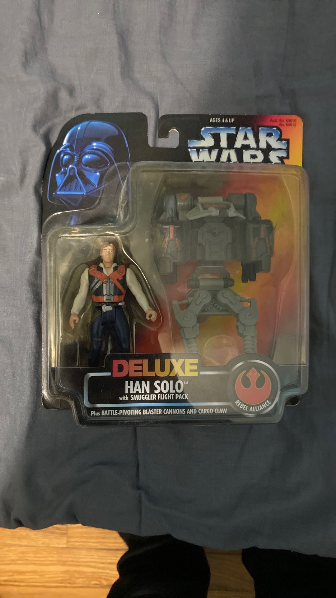 Never opened Sealed 1996 Hasbro StarWars Deluxe Han Solo With Smuggler Flight Pack