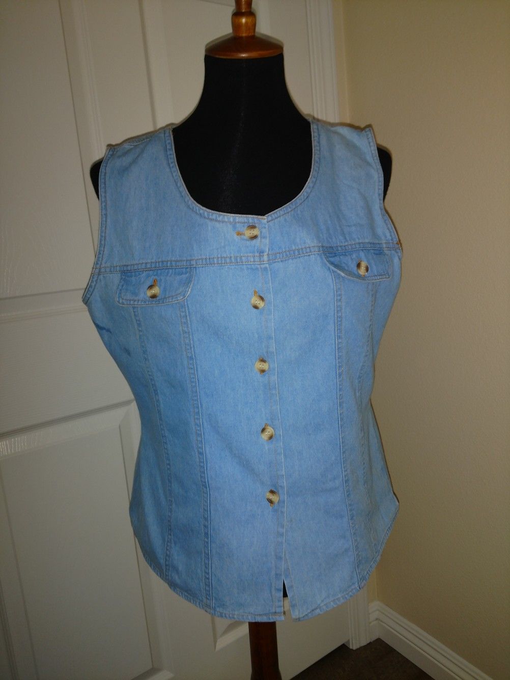 Super soft denim, button front, two front plackets (no pockets). Tie-back. 100% cotton. Washable. One area, back of left shoulder, has one pulled thread, came that way originally. Shown in photo. Side seam to side seam at underarm, 21in chest. Length from back of neck line to bottom hem, 22 and 1/2 inches.