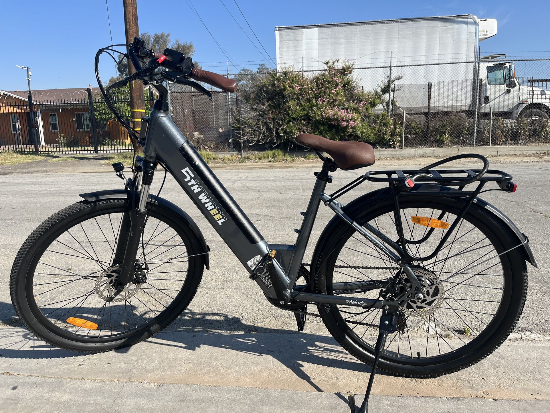 5TH WHEEL 26-inch electric mountain bike • Motor & Power: Equipped with a 350W brushless motor (500W peak) that can reach speeds up to 20–22 mph. * Battery: Features a 36V 10.4Ah removable battery with an estimated range of 22 miles (pure electric) to 31 miles (pedal-assist). * Design & Color: dark blue, featuring a high-carbon steel, step-through frame for easy mounting, designed to support up to 330 lbs. * Safety & Control: Includes front and rear mechanical disc brakes, front suspension, and 7-speed Shimano gears. * Additional Features: Comes with an LED headlight, rear reflector, smart LCD display (speed, battery, mileage),