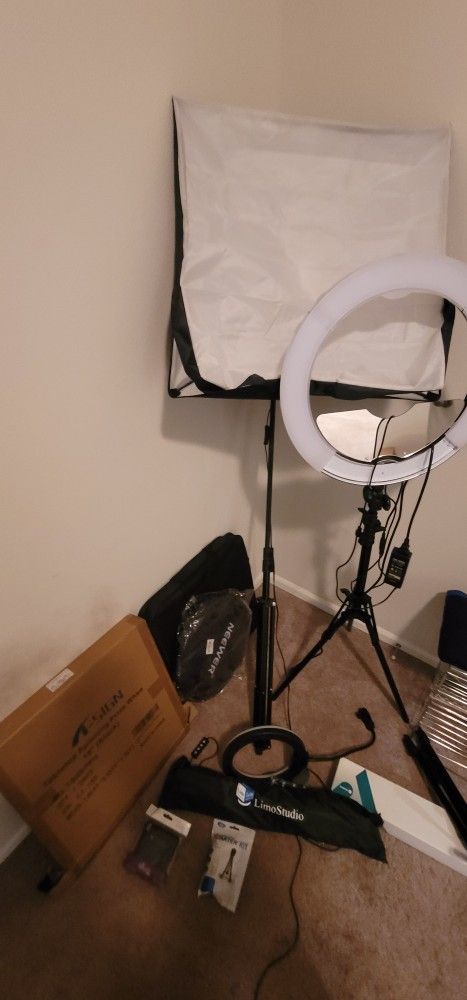 Back light, two ring lights, various phone stands, and tripods . Selling as a set $80 items new and used. See pics