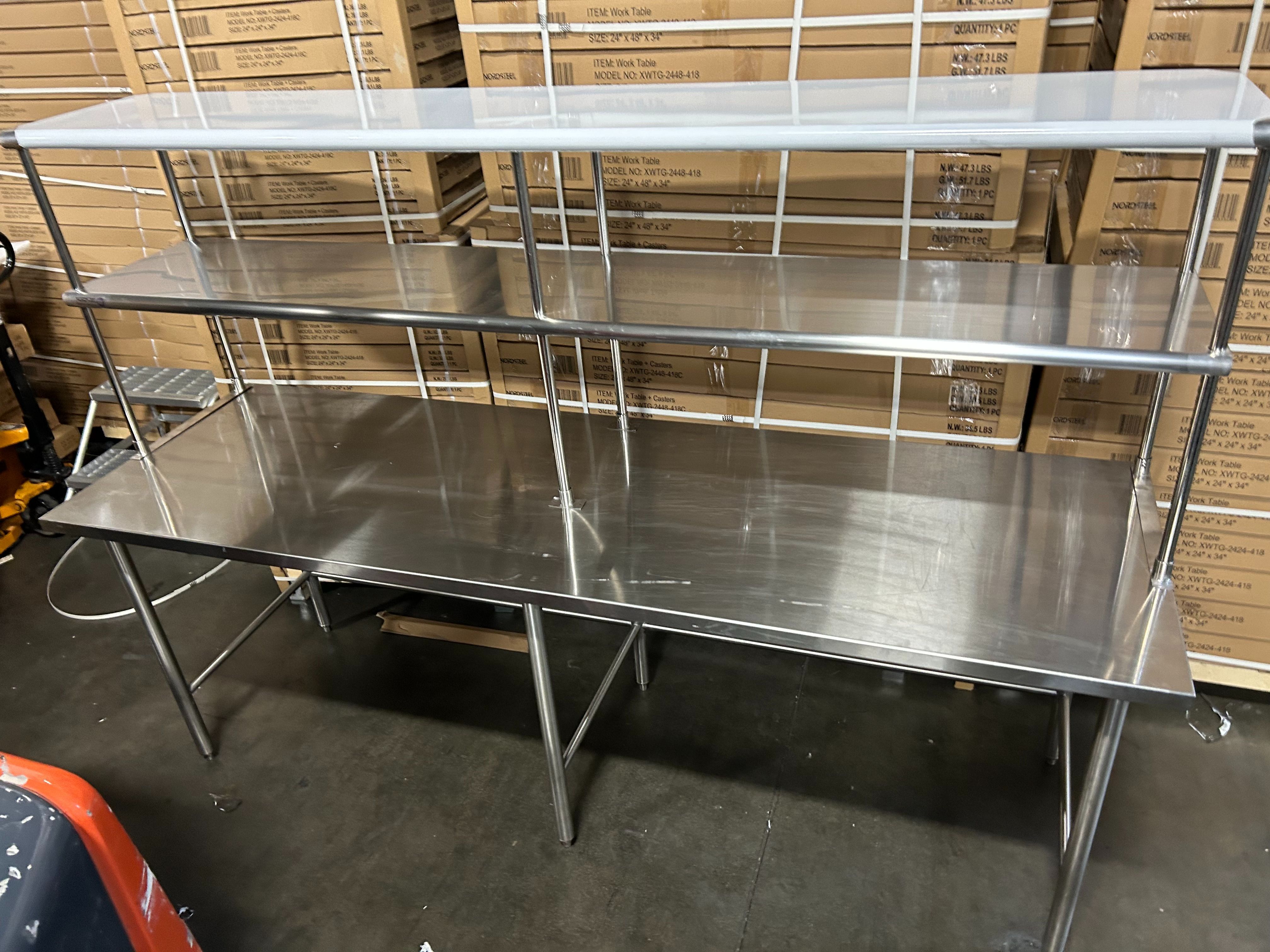 Brand new Nordsteel stainless steel work tables and prep tables. Optional drawers, wheels, and over-table shelves can be added. Heavy-duty and durable, supporting up to 600 lbs. All sizes in stock at super low prices. Ideal for restaurants, commercial kitchens, bakeries, labs, clinics, garages, offices, workshops, dealerships, warehouses, schools, churches, bars, mechanic shops, packaging centers, and flower shops.