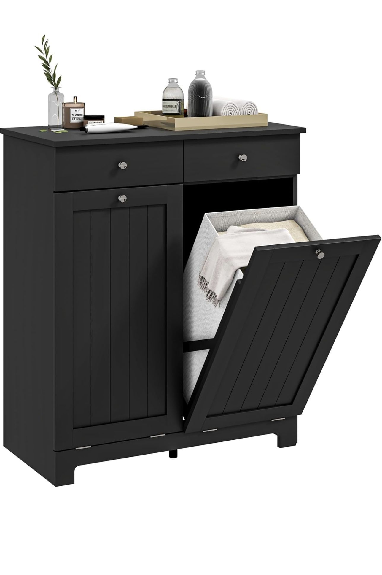 New in box. Size: 30.7" x 15" x 35.4" Tilt Out Laundry Hamper with 2 Drawers and 2 Beadboard Doors, Bathroom Hamper Cabinet, in Black