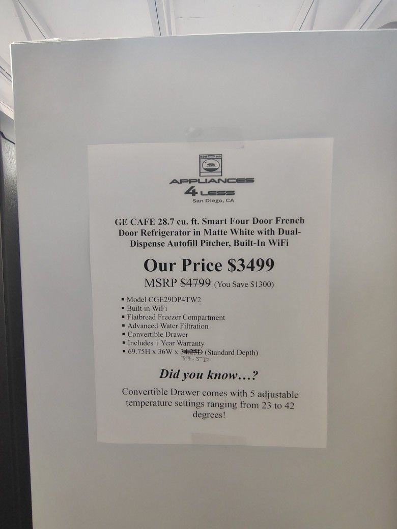Hi from Appliances 4 Less - San Diego in Lemon Grove at Ofc Cell # 909-551-1170! Since the appliance/s you are specifically want are still available as of this writing . . . Visit us in person soon at: Appliances 4 Less San Diego Lemon Grove Branch 7875 Broadway Avenue Lemon Grove, CA 91945 Ofc Cell # 909-551-1170 [email protected] Mon to Fri 11am to 7pm Sat & Sun 10am to 6pm We take credit & debit cards, cash, as well as financing by SNAP and Koalafi. For additional fees, we also Deliver and Install (while also doing Haul Away to recycler of old appliance/s being replaced) within a 60-mile radius of our 91945 zip code during the ff. days of the week: Wednesdays, Fridays, and Saturdays Customers with suitable transportation, physical manpower, and gear/equipment to secure appliances in transit are also welcome during our posted office hours to Pick Up & Self-Install appliances they buy from us. Our open box/new in box/never used/overstock/only slight cosmetic scratch & dent items appliances come with Free Seven/7-Day Store Warranty and Free One/1-Year Warranty to fix or replace appliances acquired from our store.
