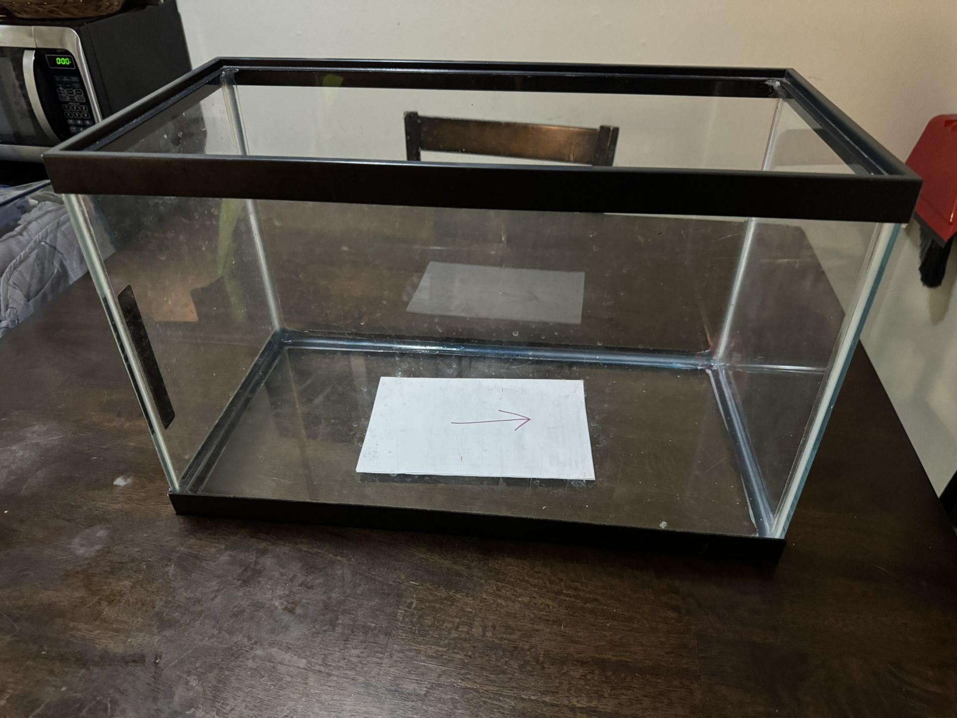 20inch wide x 12inch tall x 10 inch width fish tank. Includes a filter, heater, aerator, and everything else seen in the pictures. Everything works perfectly and there are no leaks in the tank.