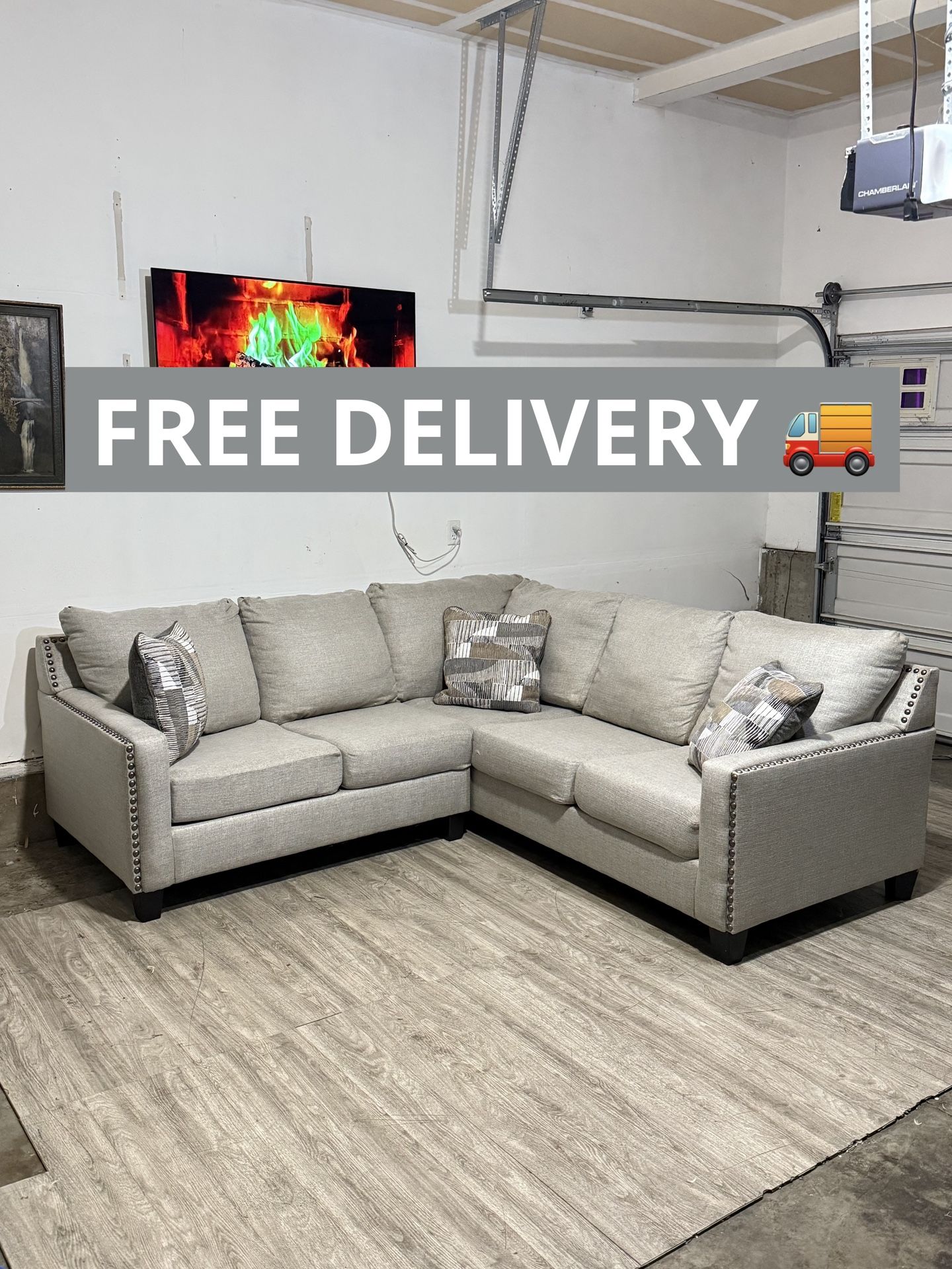 We are offering Free local delivery on this two price sectional from Ashley Furniture. In overall good and clean condition with just normal signs of wear. No tips, tears smells or stains. It measures 92x92 , breaks into two pieces and bottom cushions have been removed and machine washed. The rest of the couch was just professionally cleaned π§Ό If interested, we can deliver to you and can even help load it into your home π