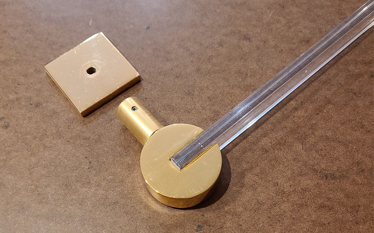 Lucite (clear acrylic) and brass 18" towel bar with hardware. Brand name is unclear, but build quality, weight, and finish is top notch. Lucite has entrained bubbles, which is a desirable aesthetic if you're going for that look.