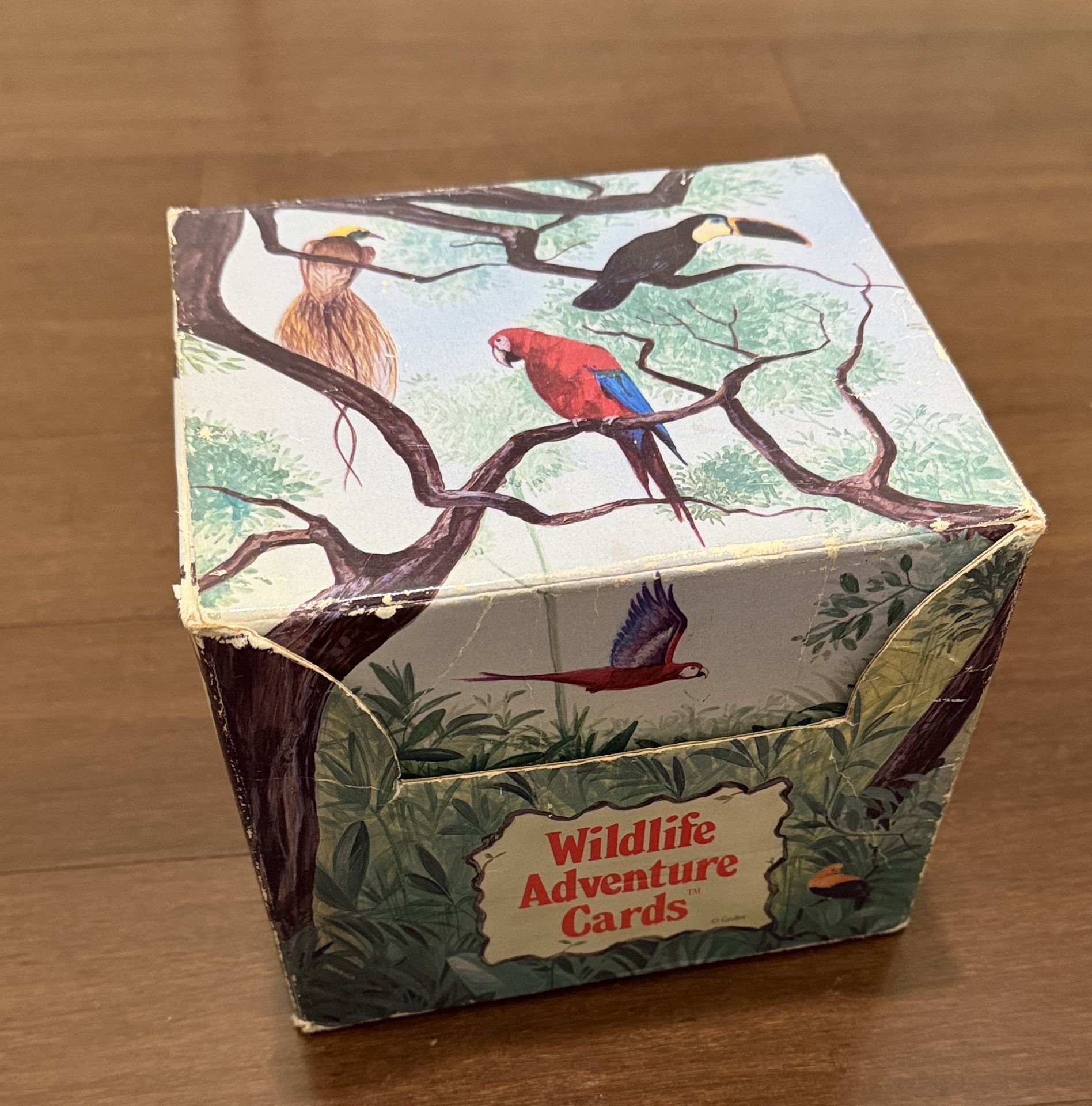 Wildlife Adventure Cards Grolier 1991 Animals Educational Teaching Box Set. Colorful box featuring wildlife adventure cards. Vibrant bird illustrations on the cover. In excellent, pre-owned, condition. Complete set. Box shows some wear.