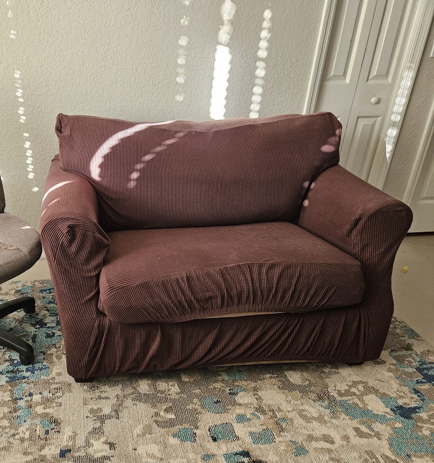 Solid base but has pet damage to the fabric, hence the covers. Has a pull-out single bed (you would need to replace the mattress). Haverty’s brand. SMOKE FREE HOME. Please message with any questions! We also have a matching chair for sale. $75 for both (chair and love seat). Sorry, we are unable to deliver. Local pickup only. Moving sale. Check out our other listings!