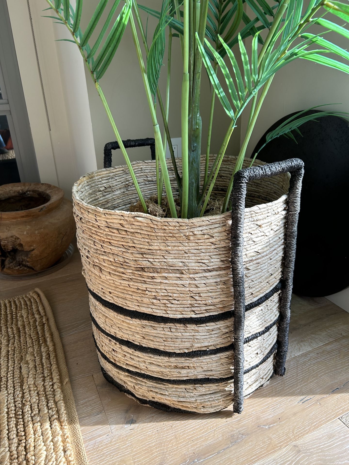 Palm tree is approximately 7 feet tall. Spread is dependent upon placement. Purchased from cb2. Selling for $100. Basket container is sold separately. Container is 19” tall and 20”across. Container sells for $50. Cash and pickup only.