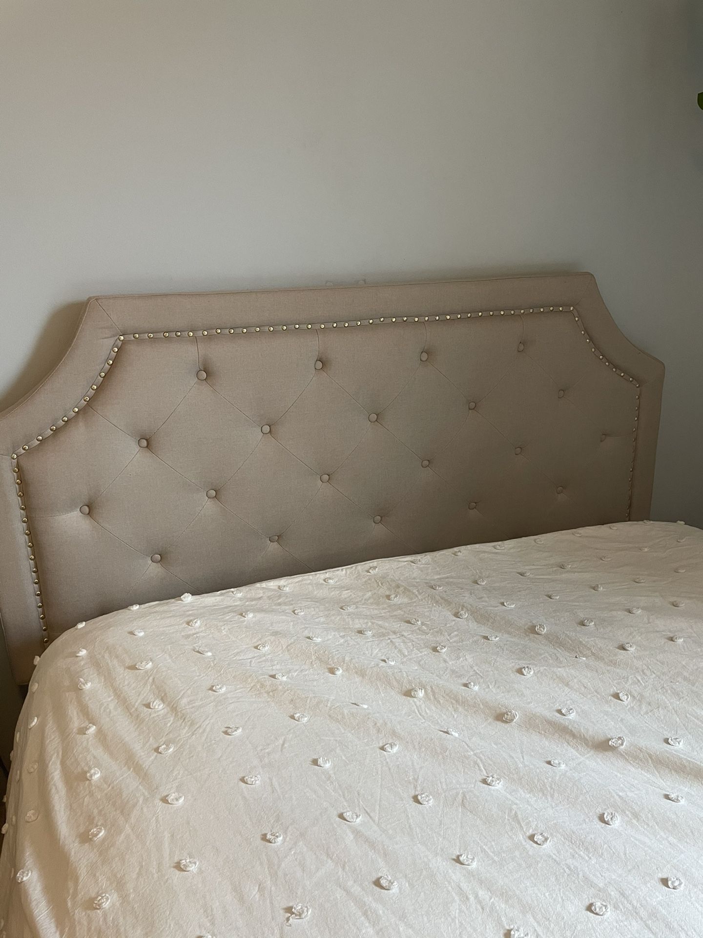 A queen size headboard AND bed frame! Does not require a box spring as there are wooden slats beneath like the aqua bed frame featured in photo. Beige, and tufted with gold buttons. Very complementary to any room color! Have had for 2 years, moving and can’t take with me. There are scratches in the bottom left foot from cat but cat hasn’t been around in a while and they’re not TOO noticeable- nobody has ever seen them except for me. I love this bed so much but unfortunately cannot move with me, must pickup in South Boston. Accepting all offers!!!
