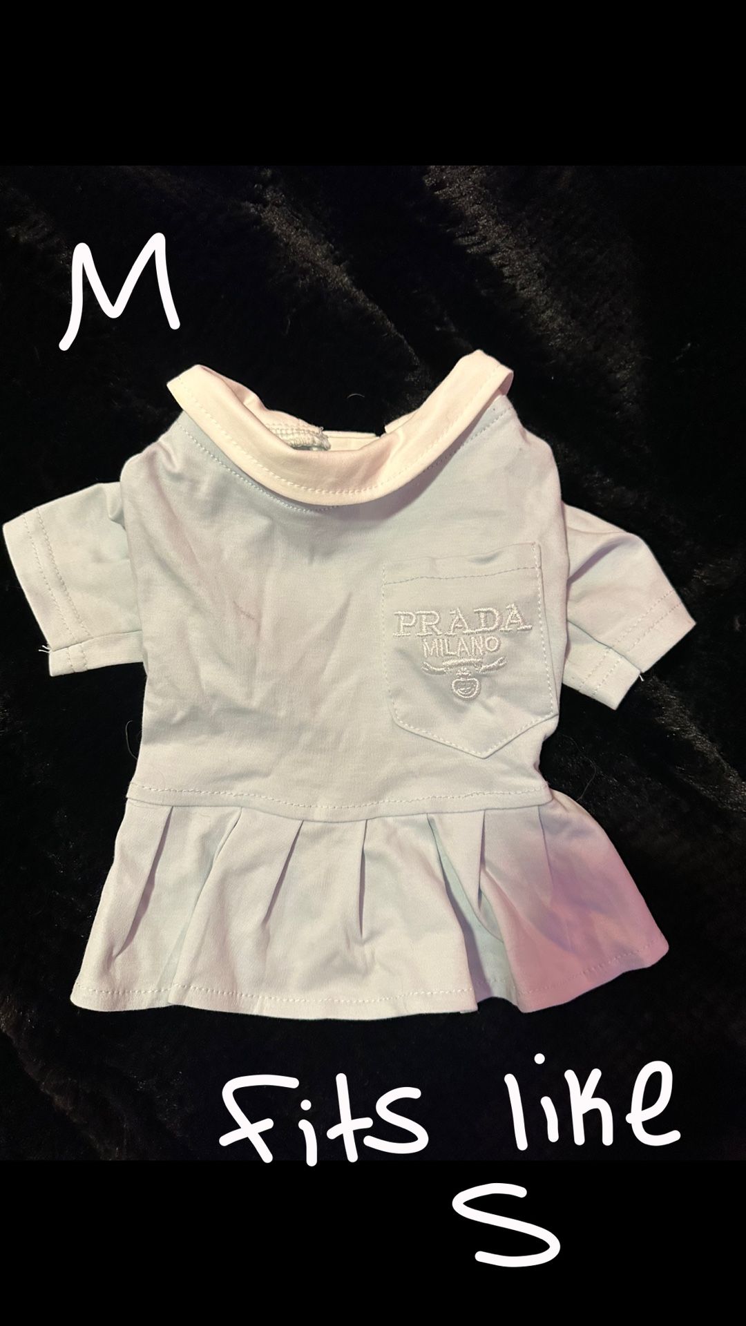 prada dress- paid $35 + shipping so charging at least $25 lowest is $20 but have to pick up (never worn-too small on my puppy) its m but fits like a s depending on dog pinkish harness- paid 15 charging $8 never used (was too big on my puppy now too small) pinkish dress- $5 black & white dress- $5 juicy couture- both new one with tags one without because i had to try on my dog. paid $12 each charging $8 each blueish harness- used $5 rain jacket- never used paid $10 charging $5 socks- never worn just tried on, $5 take all for discounted price, will also sell individually