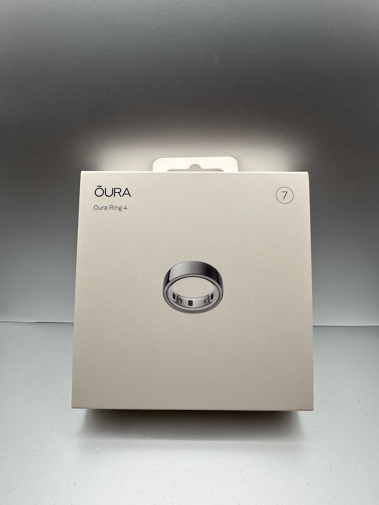 Oura Ring 4 smart ring in Silver, Size 7 Includes: • Oura Ring 4 (Silver, Size 7) • Charging dock • Charging cable • Original packaging/box (as shown)