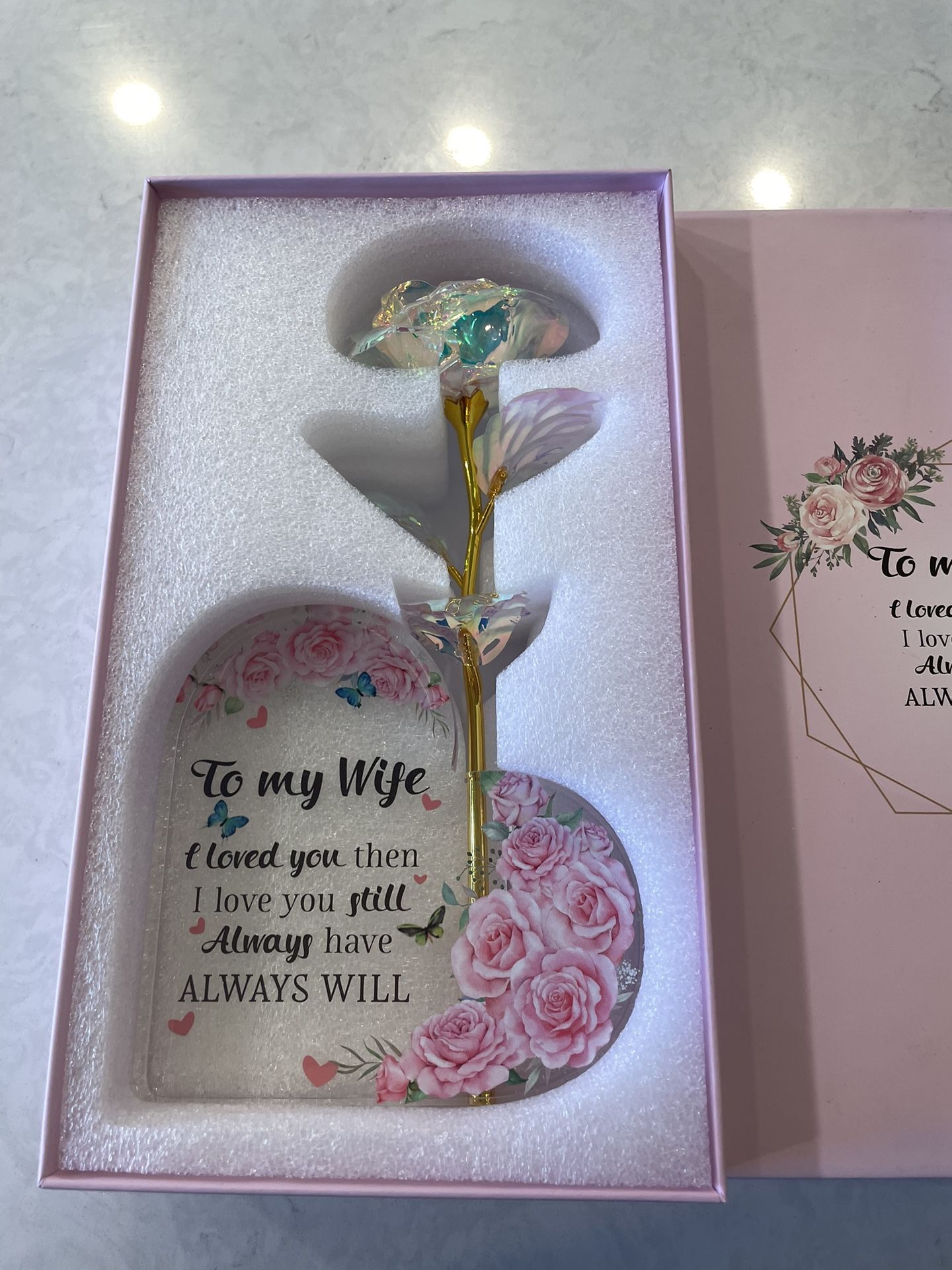 Perfect for Valentine’s Day , Anniversary & Birthday Looking for a gift to give your wife on Mother's Day? Our Mother's Day gift set includes an Eternal Galaxy Rose and a beautiful acrylic heart table sign. Show your gratitude and love for your wife with this heartfelt and unique gift. The Eternal Galaxy Rose in our gift set is a stunning work of art, crafted by skilled artisans using clear plastic petals and leaves with a gilded gold foil stem. It's a symbol of eternal love and appreciation that your wife will cherish. The acrylic heart table sign is adorned with flower patterns and leaves, adding a romantic and warm touch to the design. Measuring about 15 x 15 x 1.4 cm/ 5.91 x 5.91 x 0.55 inches, it's the perfect size to be placed in various locations without taking up too much space. The crystal-clear heart keepsake also features sincere and sweet words, making it an ideal way to express your gratitude and love for your wife. Crafted from high-quality acrylic material, our Heart Acrylic Sign is safe, reliable, wear-resistant, reusable, and not easy to deform or break. It's a warm and thoughtful gift choice for any occasion, such as birthdays, anniversaries, Valentine's Day, and more. Surprise your wife with this unique and meaningful Mother's Day gift set. It's a perfect way to show your appreciation and love for your wife, and it will bring a wonderful memory that you and your wife will cherish forever.