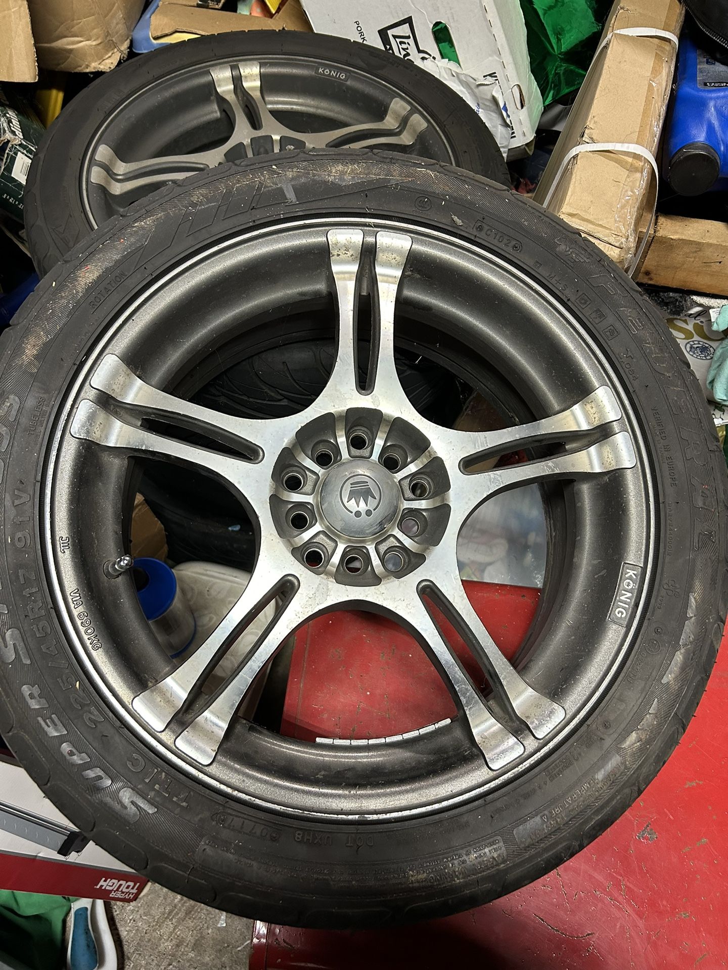 Konig Incident Graphite Wheels and Tires 2 of the tires have good tread left, 2 not so much. I’m told one wheel has a crack. Off a 2002 Honda Accord, although these have a multi or universal bolt pattern.