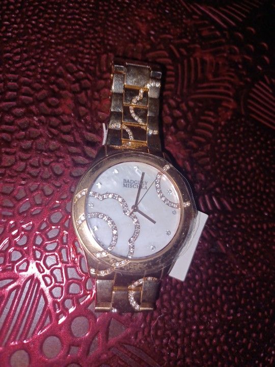 Badgley Mischka women's watch Polished Gold rose tone bracelet Swarovski crystals in a rose design I never used it . Still has the plastic cover. Works well. Battery is good