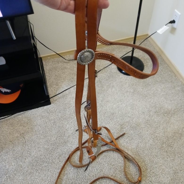 Never used, leather , with long reins. Tan in color, silver tassels.