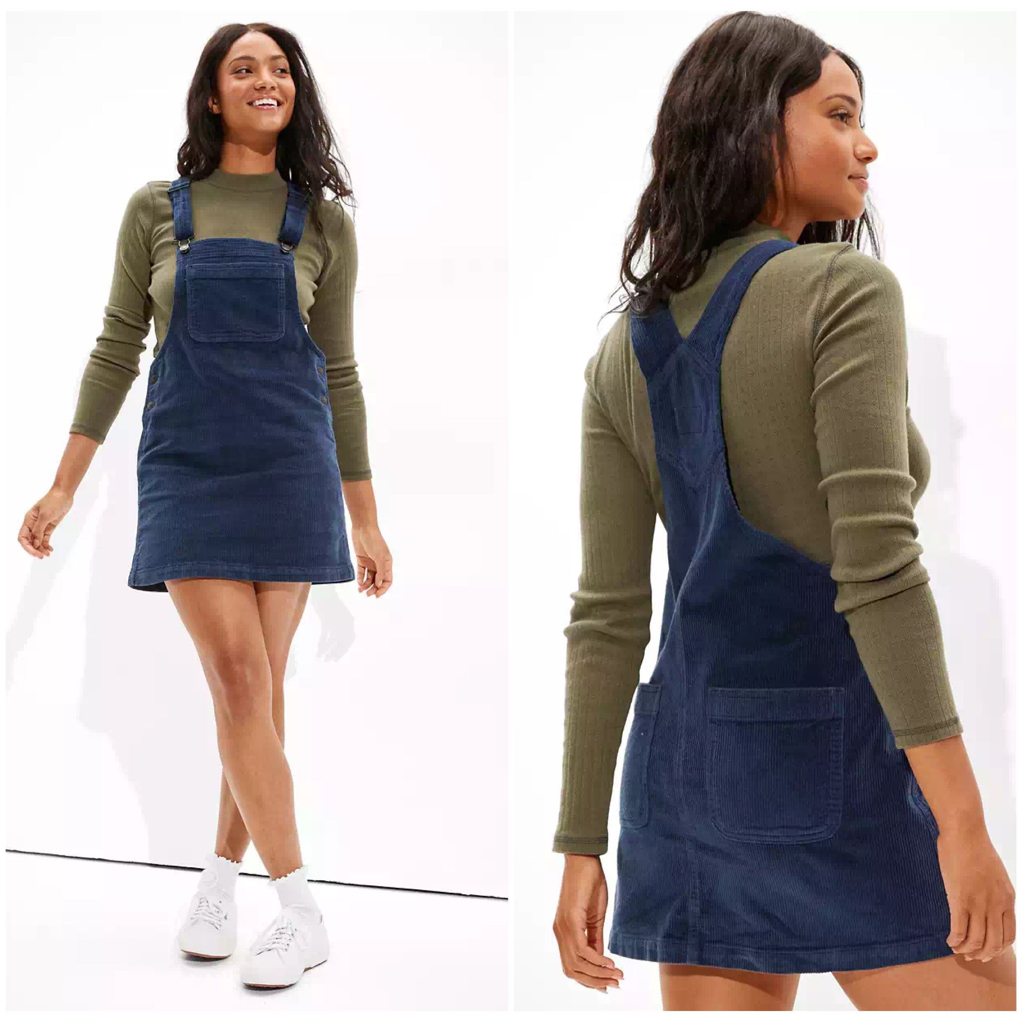 New AE Corduroy Overall Mini Dress Size S Our statement corduroy is perfect for all your fall plans. Rock this overall dress with your fave tee and booties. Made from our soft corduroy Overall straps WOT Style: 0(contact info removed) | Color: 410 Materials & Care 97% Cotton, 3% Elastane Machine wash Imported