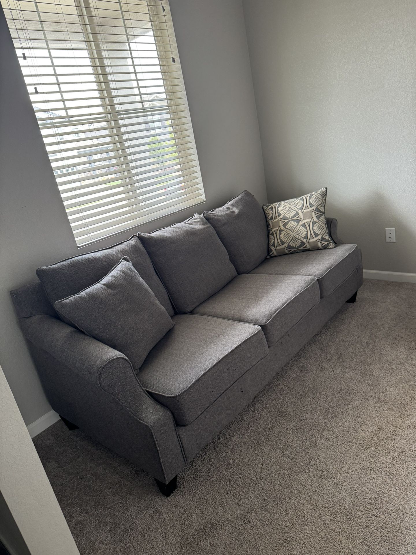 Selling my gray couch with cushions and pillows. Hardly used and I Need it gone ASAP. Moving and I can’t take it with me
