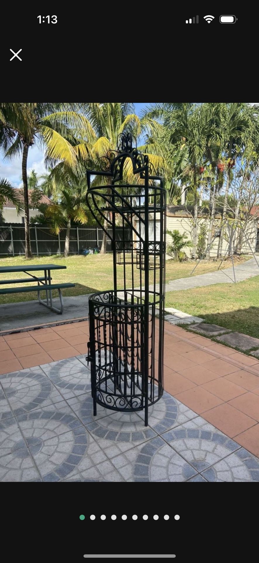 Black metal bar stand with wine glass holders at top, liquor glass holder in middle, and wine/ liquor bottle stand at bottle with latch. Great condition. Can be for outdoor or indoor use. For sale $75 or best offer.
