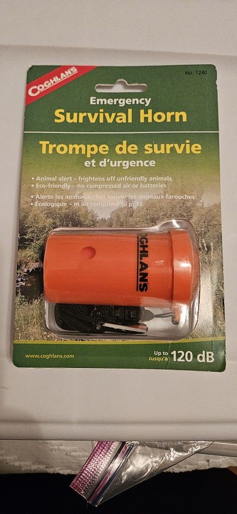 New in package Coghlans Emergency Survival Horn Up to 120dB with no batteries or compressed air Perfect for hiking & camping to frighten away animal