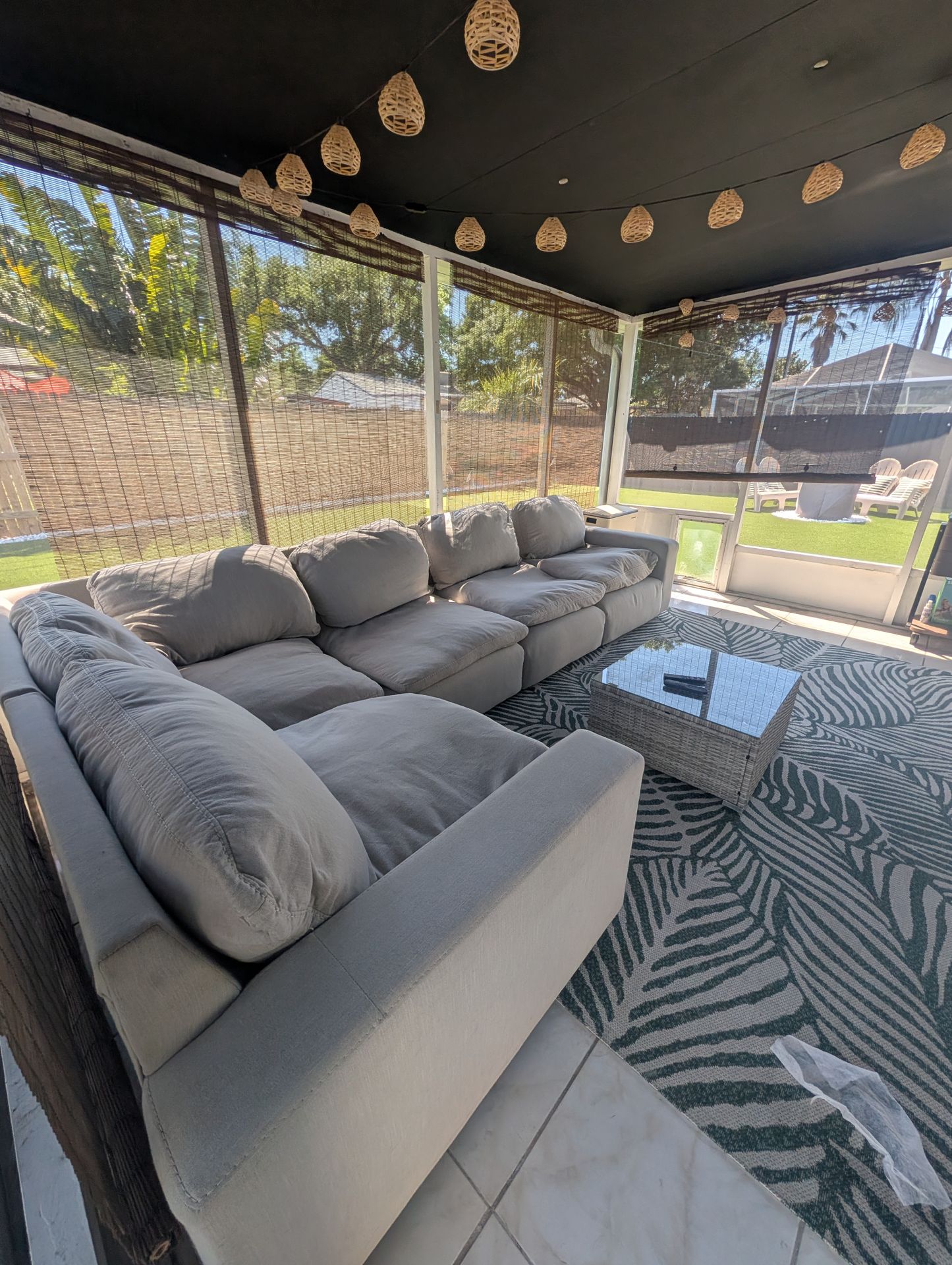 Used. Older Ashley cloud couch. Feather. Removable covers. One cover is missing a zipper. Grey/ white. 11.5 ft long side length 6.5 short side length $300 Need removed asap