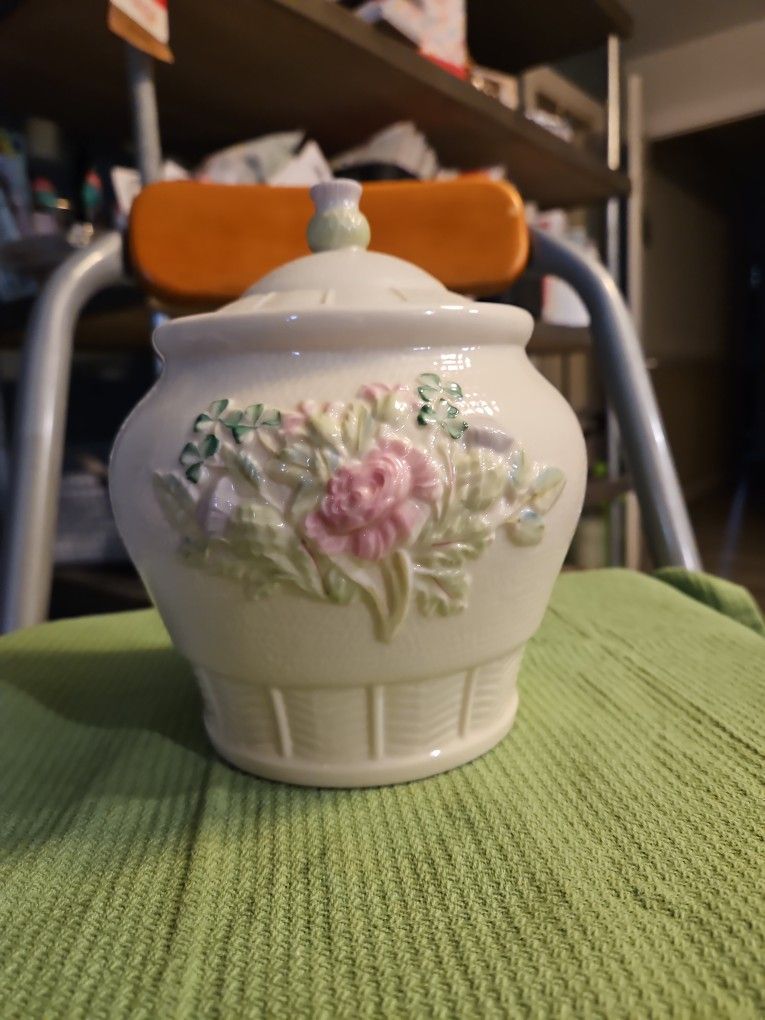 7 3/4 " with Lid on. excellent condition with light pink flowers and greenery on front