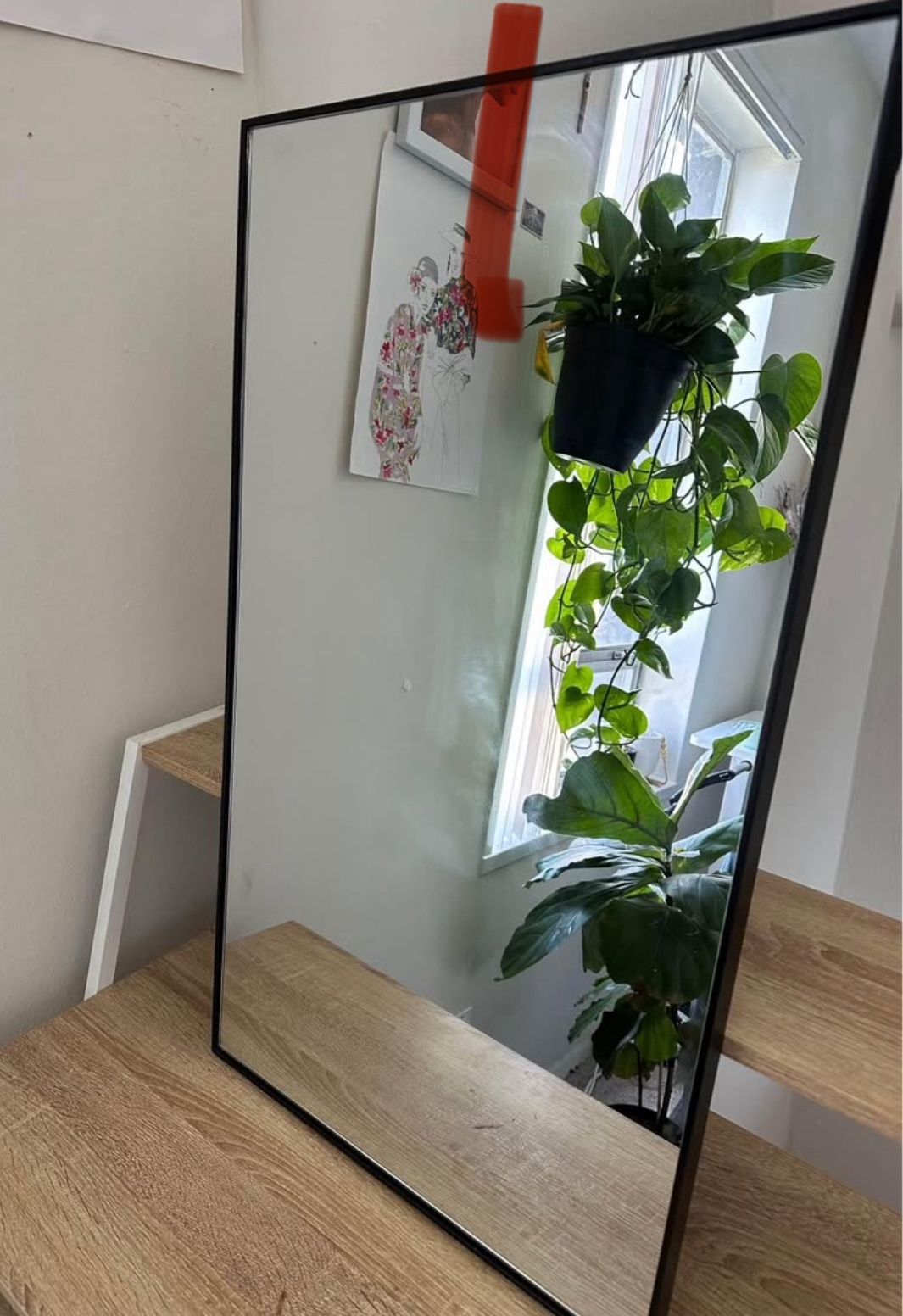 This mirror is perfect for any space. Mirror measures 18L x 1W x 31.75H in. Black wood frame finish Crafted of wood and glass Rectangle shaped mirror Weight: 11 lbs. Comes ready for wall mount; no additional hanging hardware required Care: Dust with a soft, dry cloth. To clean mirror, spray a small amount of glass cleaner onto a lint-free cloth and wipe clean. Originally from Kirkland’s Home Store. Pick up in Mid City