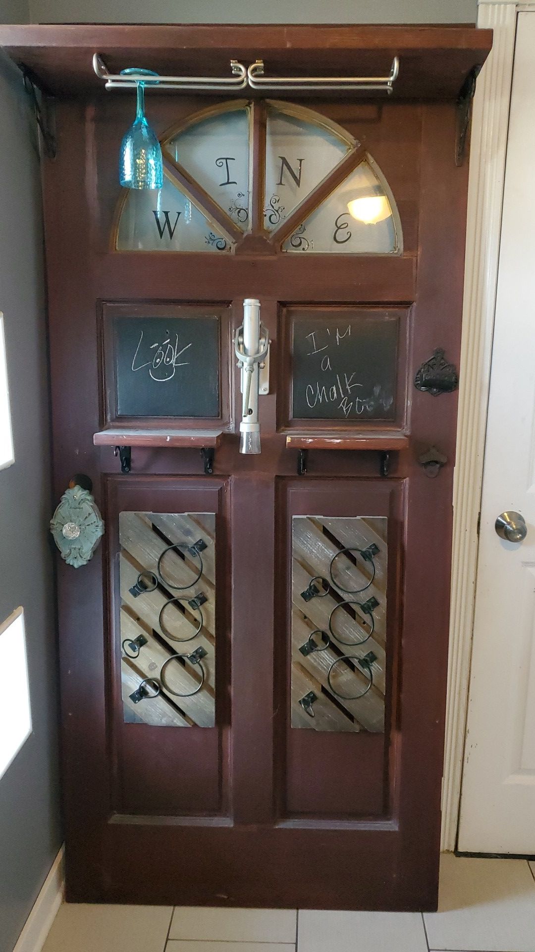 Great functional conversation piece. Has wine opener, bottle opener, wine rack, and wine glass holder. I used as a pantry door and used magnets to keep closed. My husband made a stand so can stand alone.