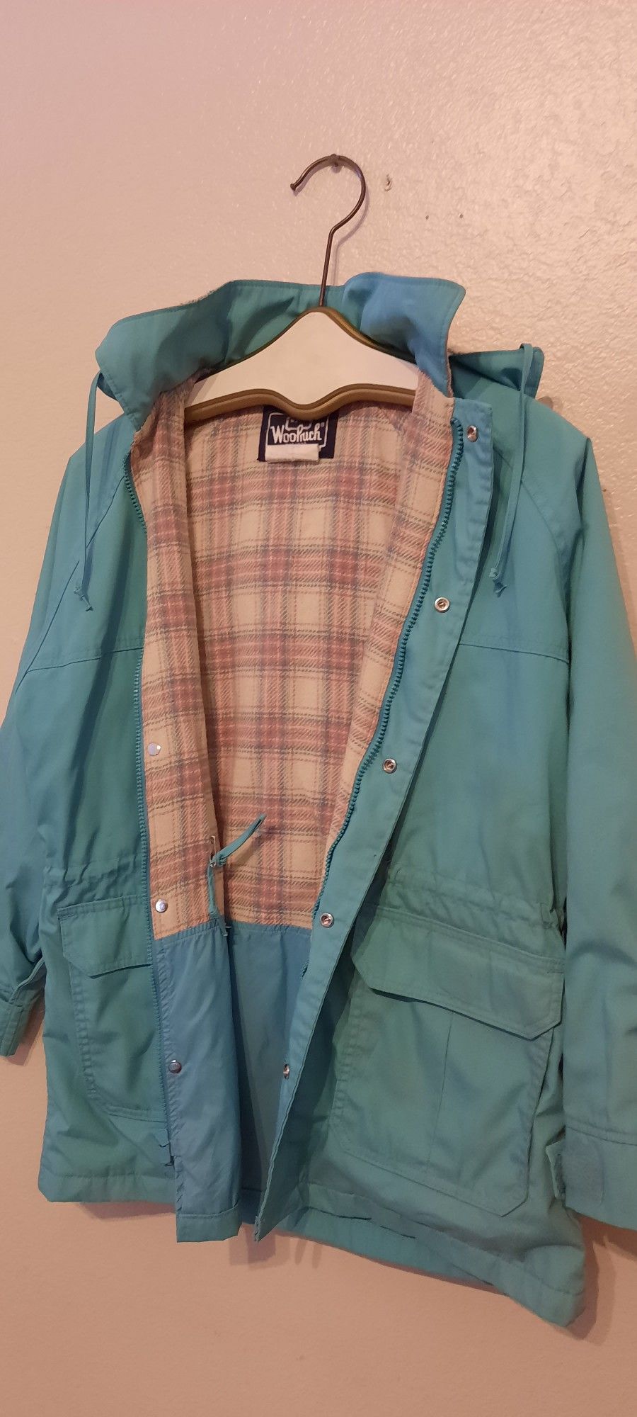 Vintage Woolrich Womens Jacket, Size Medium, Teal Color, Pink Plaid Wool Lining, Waist Drawstring, Adjustable Wrist Cuffs, Zipper And Buttons, Pockets