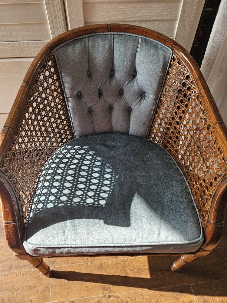 Mid Century Cane Barrel Back Armchair Chair Baby Blue Tufted