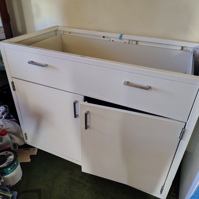 two cabinets, large one is 42 x 22 x 35 in , small one is 18 x 22 x 35 in. large one comes with a shelf, missing brackets. right door does not stay closed. some wear and tear from storage , were not used.