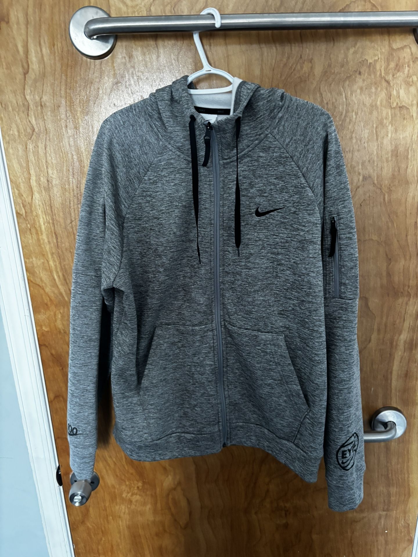 Heather gray Nike Tech–style fabric • Full-length zipper • Hood with black drawstrings • Black Nike swoosh on the chest • Front kangaroo pockets • Zippered utility pocket on the sleeve • Athletic slim fit look