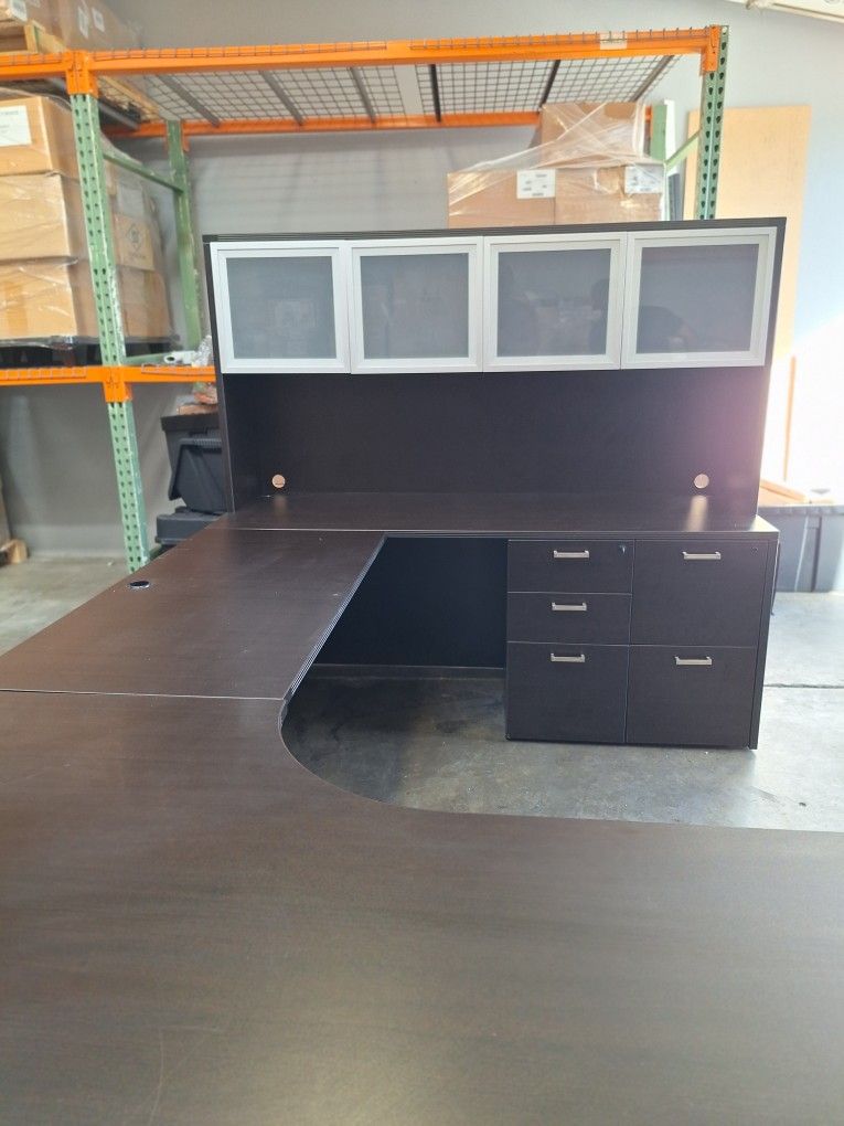 Used U-Shaped Executive Corner Desk With Drawers and class bookcase. A $3,000 dest for $100. A SUPER DEAL!!