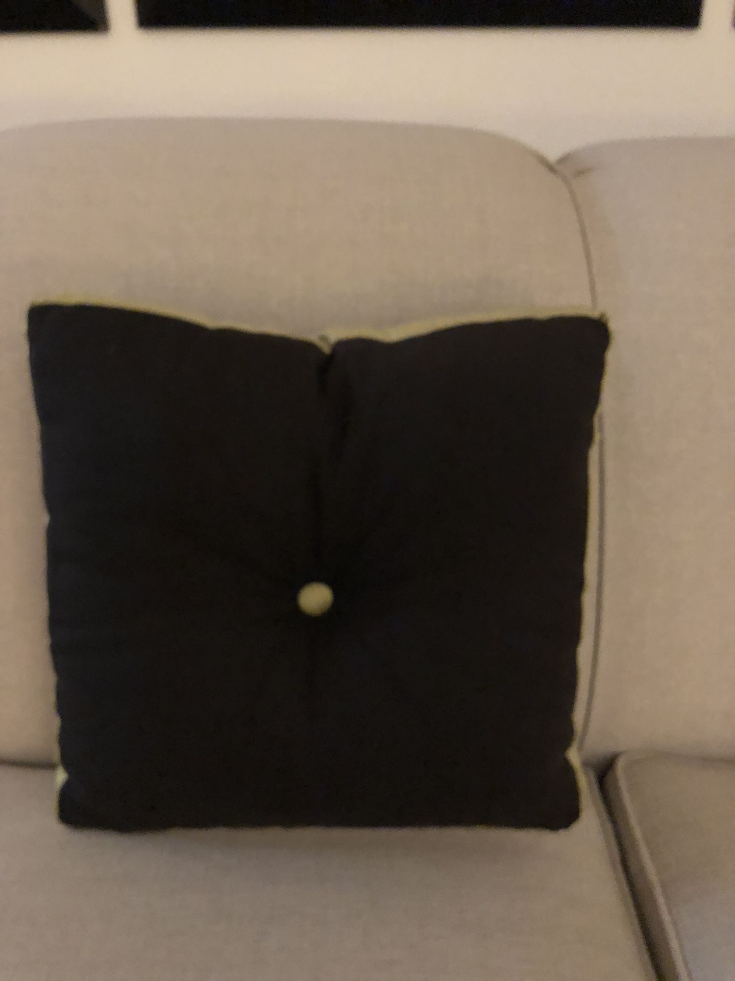 Bench, Chair, Sofa,or Bed Cushion: Interesting flat, square cushion. Works nicely on small area like bench where flatness is needed. Also breaks up monotony of larger sized cushion groupings. Holds square shape when tipped onto side. Clean. Front and back are same color (black with lime green center button),design and shape. Sides and top are lime green.