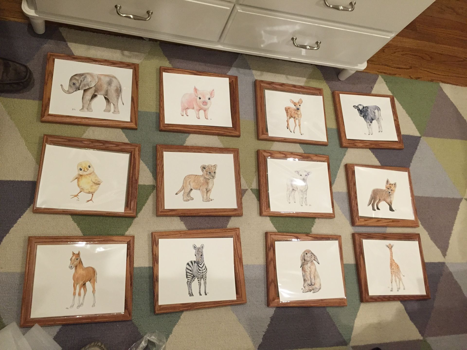 12 prints of baby animals, bought off Etsy and framed myself, used I. The baby room for years! Very cute, like new :-)