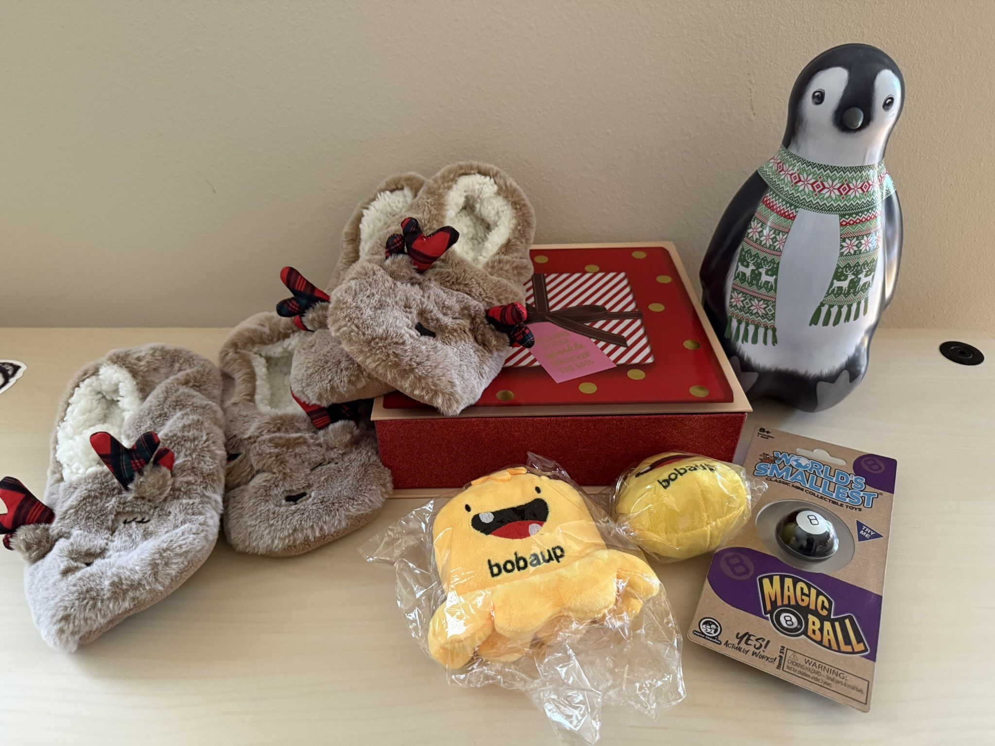 Misc new Holiday item gift Set include gift box, penguin candy case, 2 pair of sock slippers, 2 new stuffed bobaup keychains , magic 8 ball. Price is for the set. Pick up in bothell, please check my other post