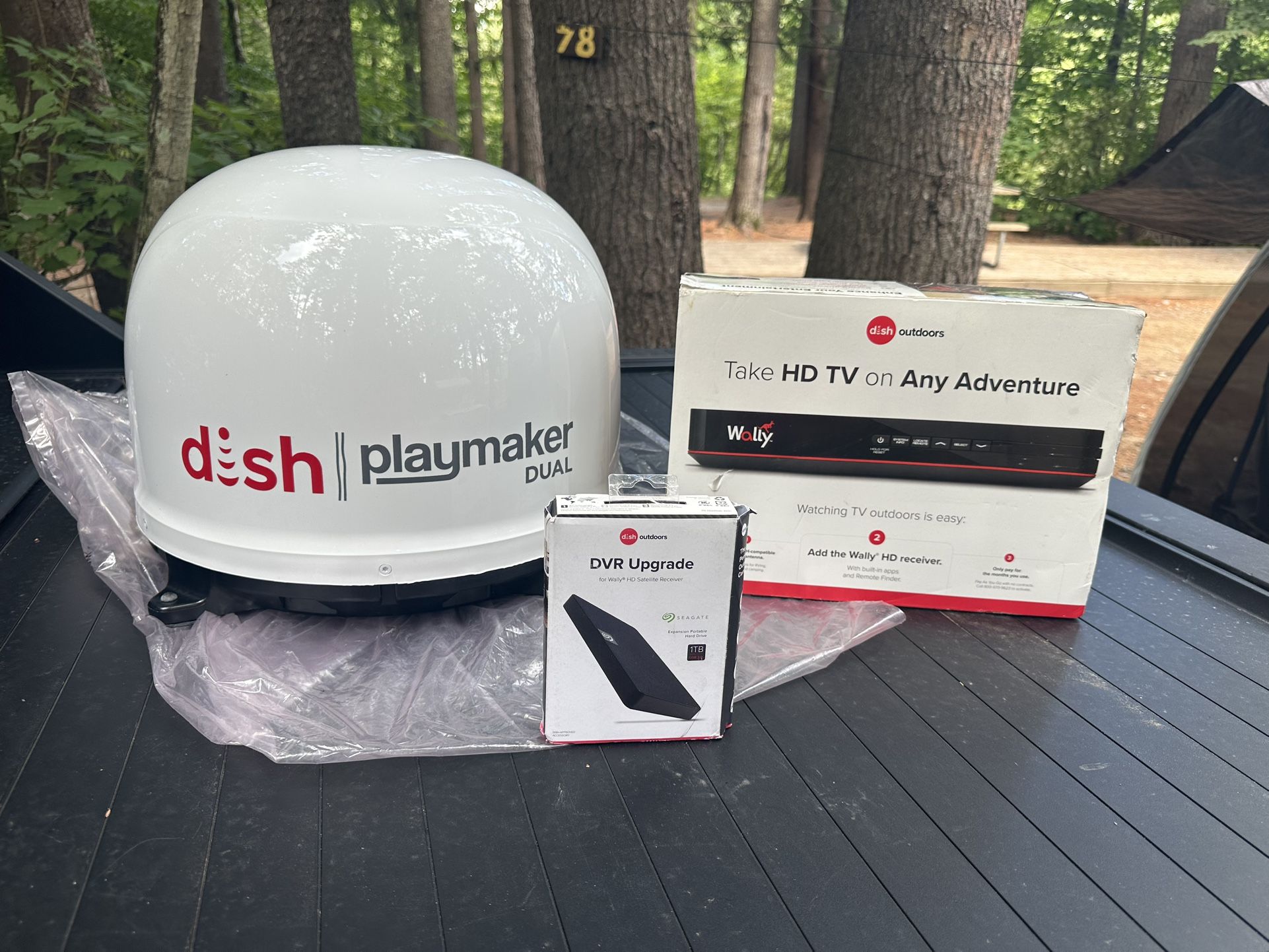 Brand New Portable Satellite Dish w/ DVR Upgrade $500 value plus $100 for the DVR upgrade! Box is missing but I have all the pictures of it including the serial number info etc.. I left it in Texas Never opened receiver and DVR Upgrade Never been set up or used at all It's in mint condition and definitely worth the price Great for camping, boating or what ever you need tv Where there's no WiFi or cable Plus you can pause your subscription For only when you are not using it