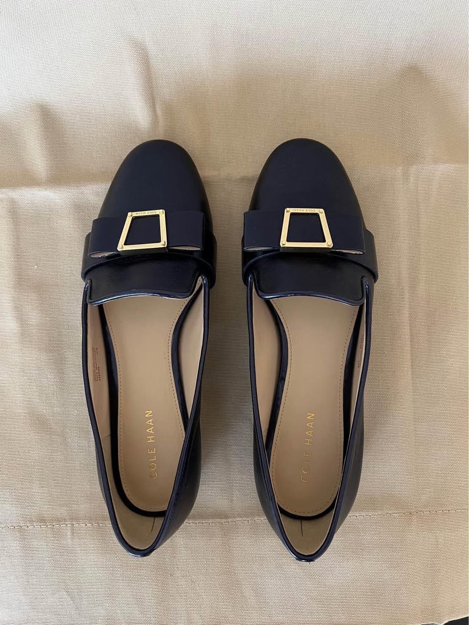 Stylish Cole Haan Navy Blue loafers. Has gold buckle detail on front. Super comfy flats, good for work or just everyday wear. Looks like new. Size: 6