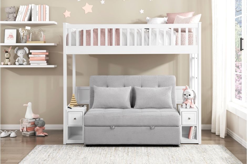 Twin Loft bed w Nightstands and Sofa bed Light Grey velvet fabric, White finish, Solid wood, others. Mattress not included. Slat system included. Sofa bed 54"xx52"- 76"x39"h. New in box ! Ready to Deliver the next Day! We offer Delivery and Assembly service for an extra cost, Ask for price ! Cheap Deliver , ask for price ! Check my list to find the Furniture of your Dreams !🤑💲💰🔥 Financing available Snap, Progressive and Acima ! Text 82685 to 48078 to apply now for Snap! Text 90129 to 22462 to apply now for Acima ! Text Brothers to 57597 to apply now for Progressive ! Address : 1212 S Bristol St Santa Ana Ca 92704. #7 10:00am to 7:00pm Hablamos Español !