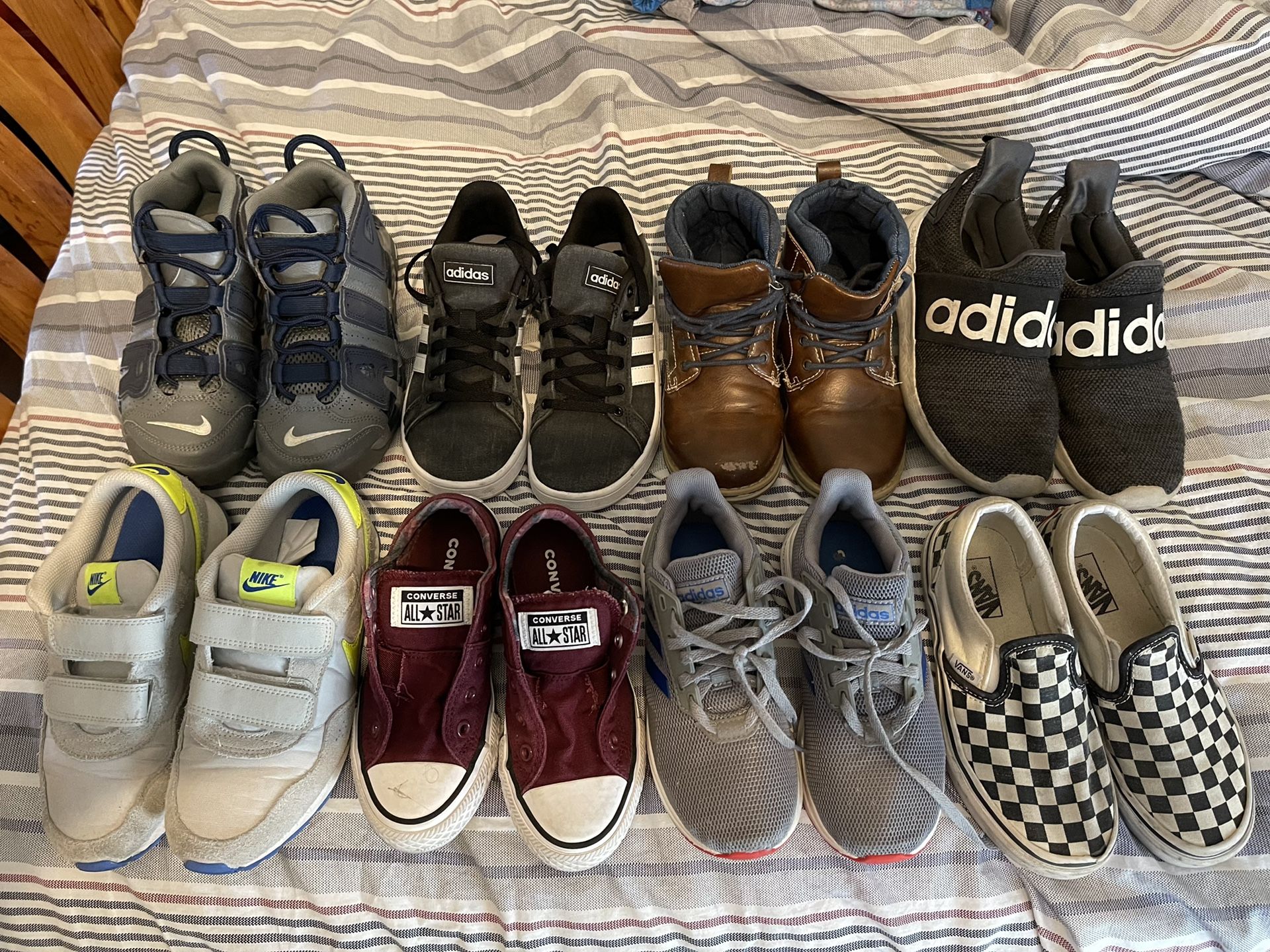 Up tempo size 3Y $70 Black Adidas size 2.5 $20 Boots size 12 $10 Adidas size 2.5 $10 Grey Nike size 3 $25 Burgundy converse size 12 $15 Grey Adidas size 13k $25 Vans checkers size 1.0 $10