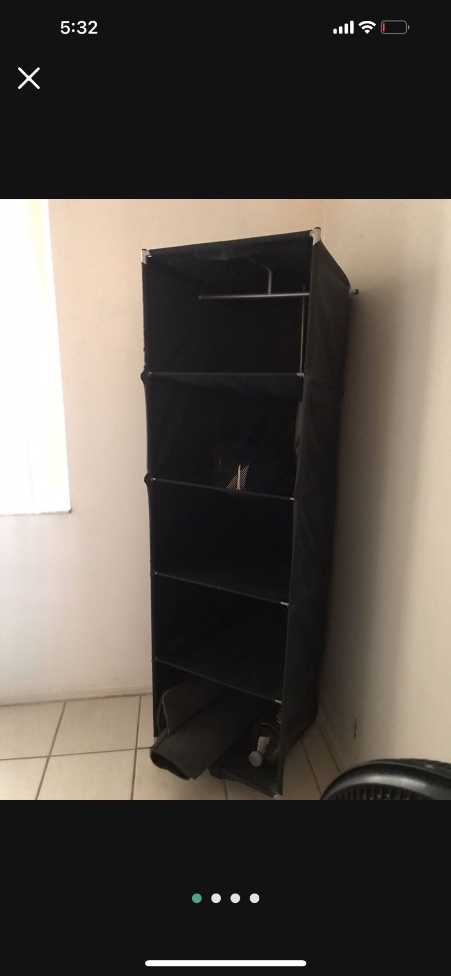 Black corner shelf with rolling wheels and handle on the back , for clothes, bed pillows , Bed sheets , and more
