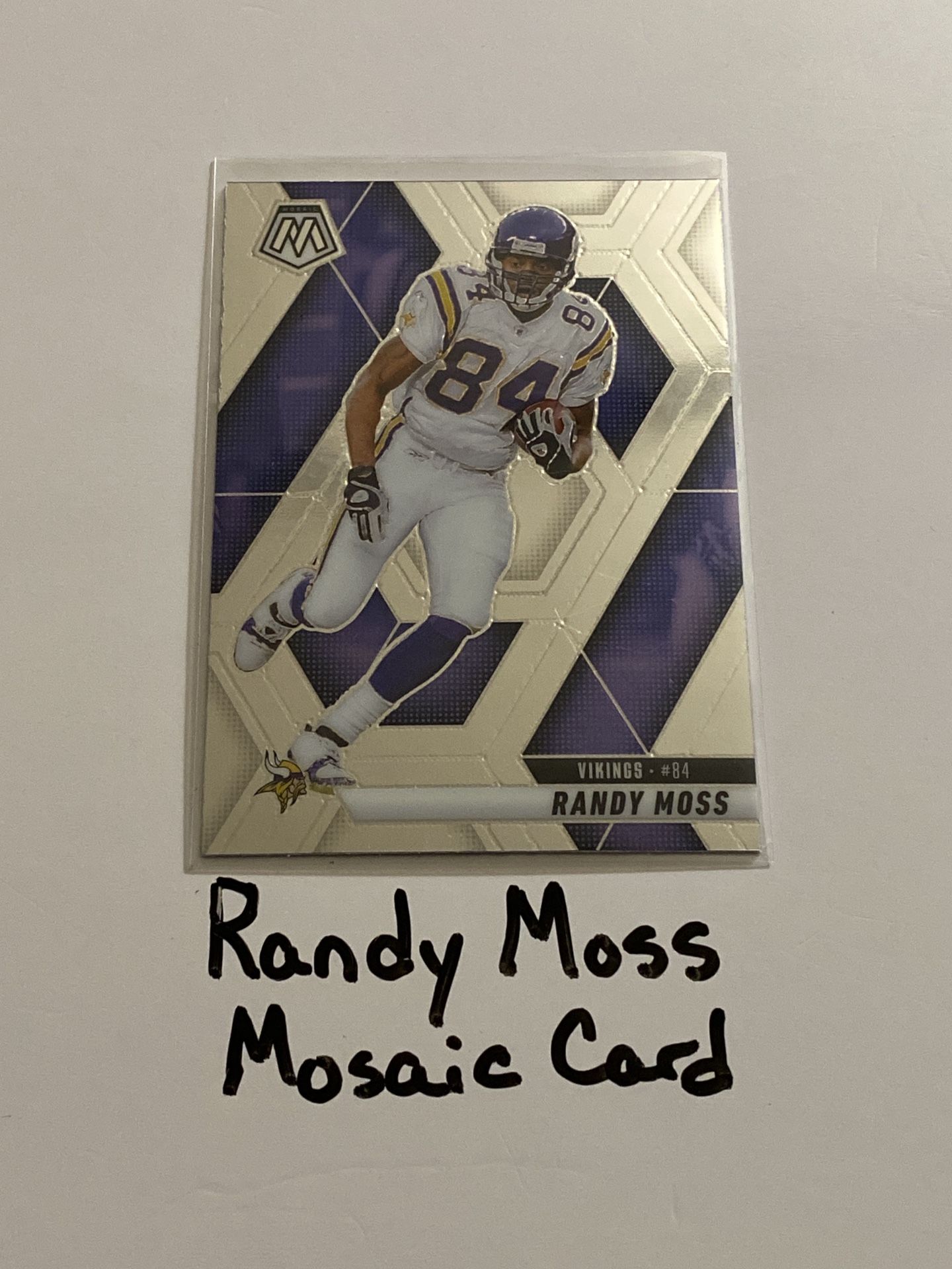 2025 Panini Mosaic Base Card of Vikings Hall of Fame WR Randy Moss. Local pick up only. Price firm. LISTING #27.