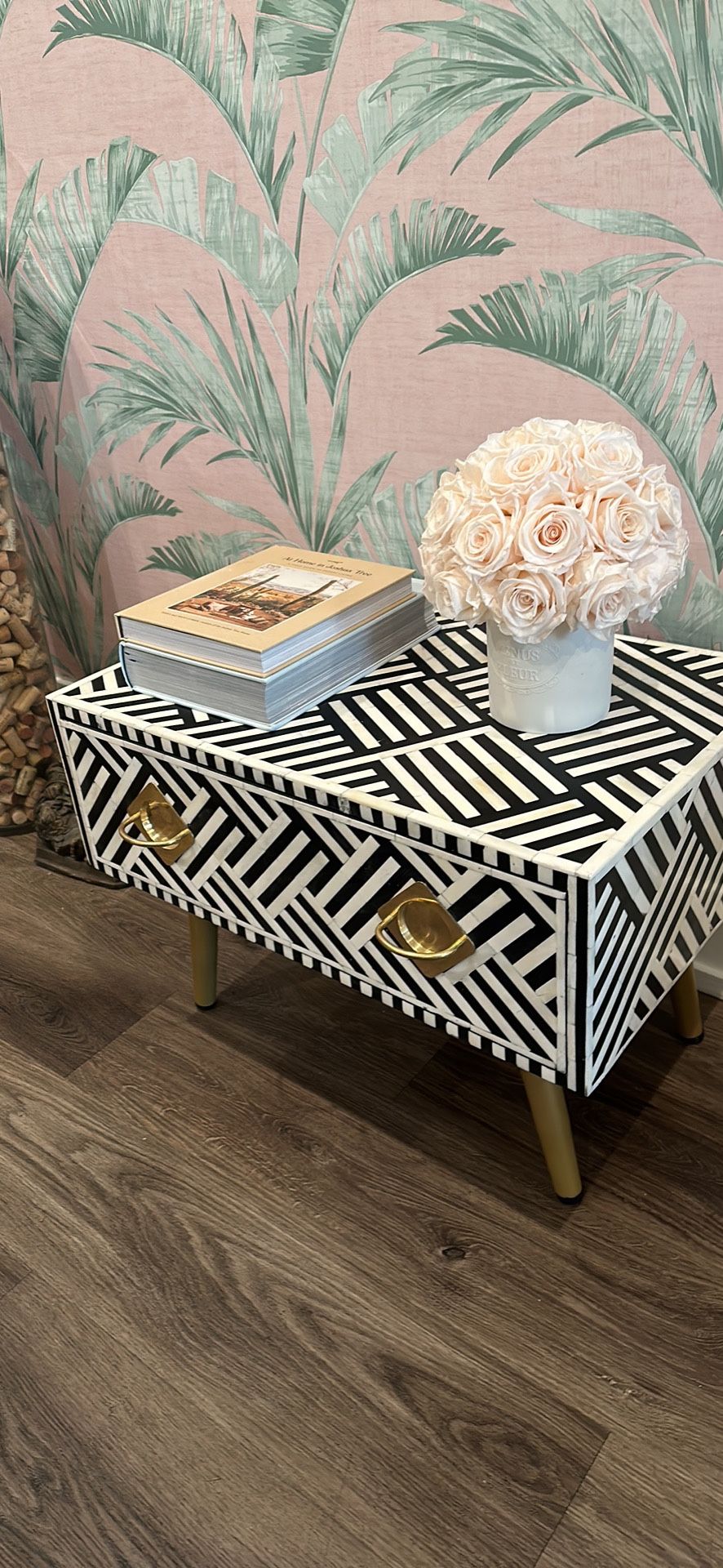 Resin bone inlay table that could be used as a coffee table or nightstand. It has one drawer and is a beautiful statement piece.