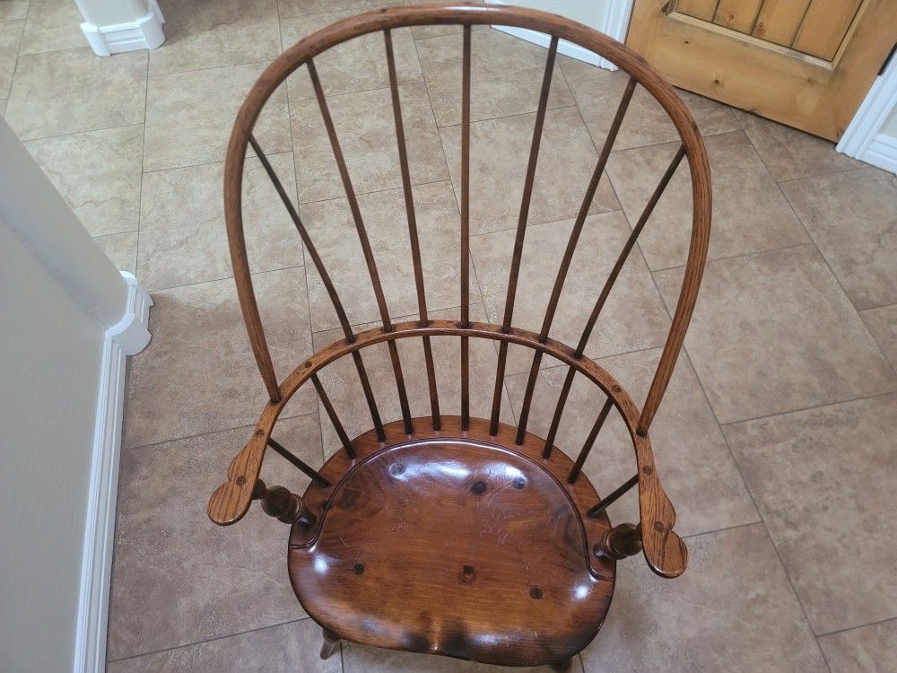 D.R.DIMES Sack back Windsor armchair American made, very sturdy D.R. dimes Windsor armchair Has signs of wear,scratches Chair has a bent back with spindles with rail back support, shaped arms with carved paddles, a unique rolled arms 45" H X 23" W X 15" 1/2 D Seat height 29 Seat width 21" Vintage, antique Farmhouse,