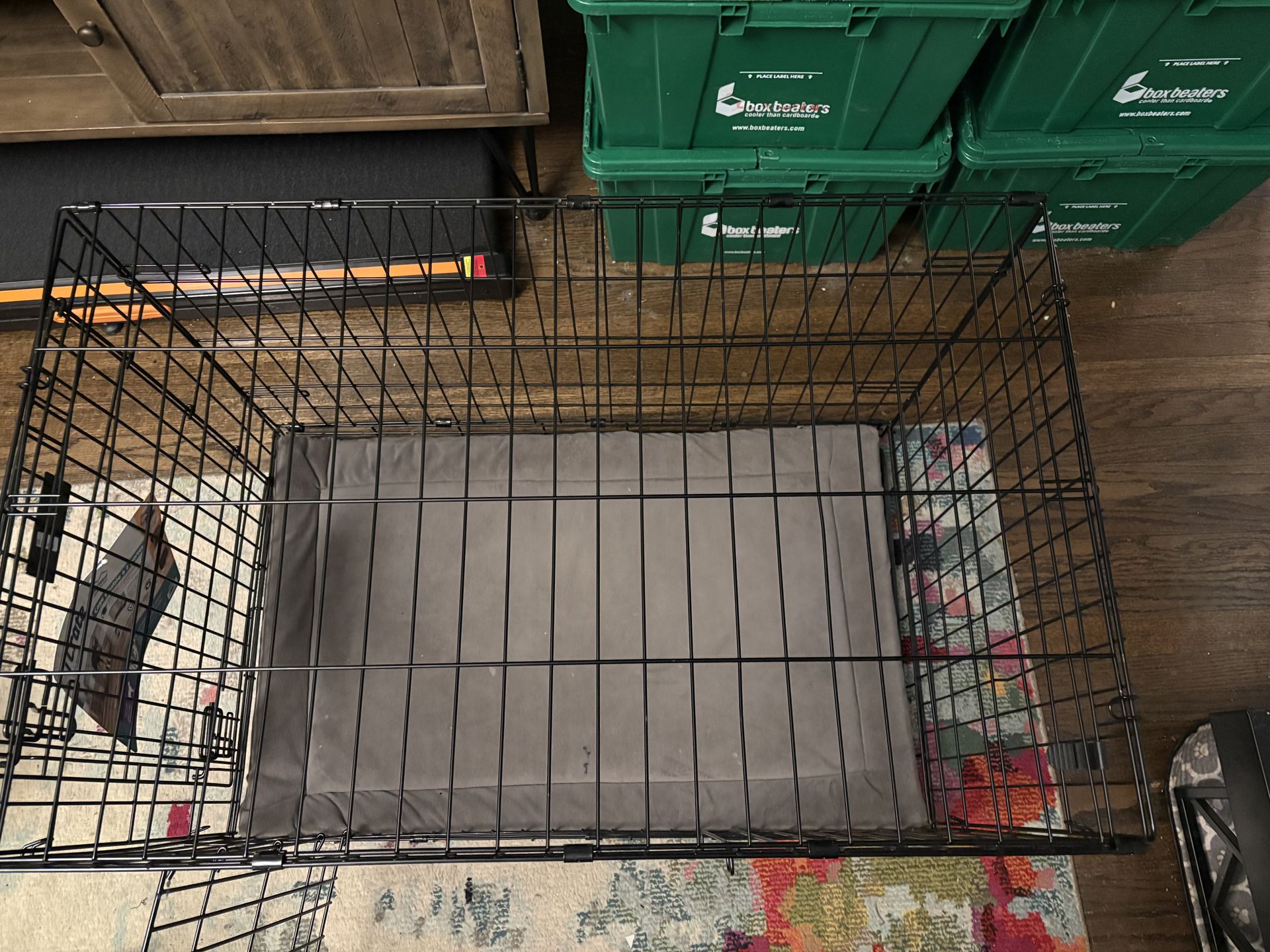 Size: Med/L: 36-in L x 23-in W x 25-in H The MidWest Homes for Pets iCrate Double Door Dog Crate sets up easily with the fold and carry configuration that requires no use of tools. This steel wire dog crate is designed completely around the safety, security and comfort of your dog. Divider included. Like new.