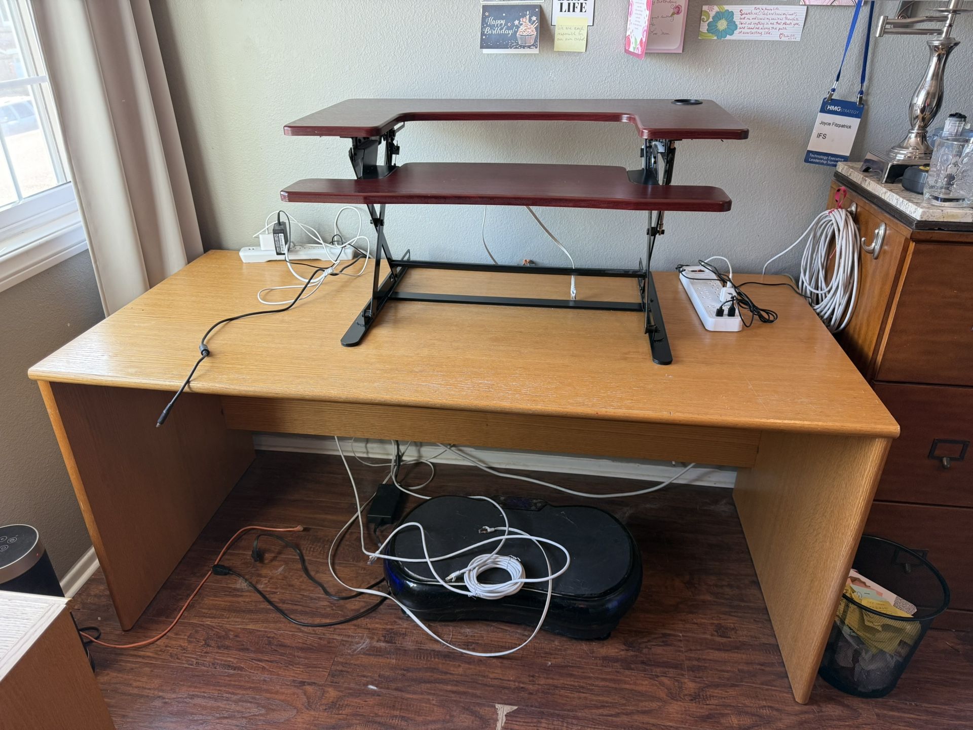 Large desk made of light oak veneer, . Sturdy and strong. Desk is 64” long and 30” deep. Small standup unit on top is no longer available.