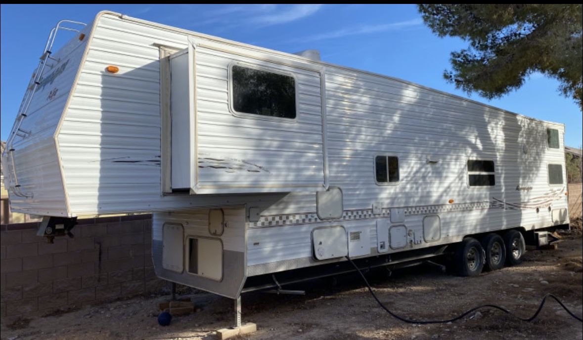 2004 Aljo Rampage Toy Hauler 38ft Comes with fresh water hoses and filter. Sewage hosing to empty tanks. All cookware, plates, bowls, cups and silverware. On board generator. Outdoor shower and awning. Also has on board gas pump for your toys. Queen bed up front, 2 queen bunk beds in back. Futon that folds down and kitchen table bench folds down to make a bed.
