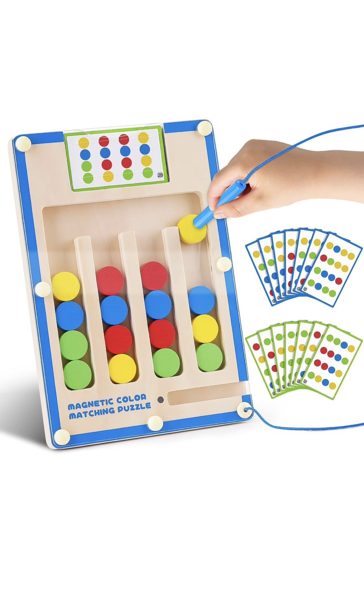 Brand new, in original packaging, wooden magnetic color matching puzzle toy. Montessori wooden puzzle board for kids. Great for practicing pen gripping, fine motor skills, hand-eye coordination, & color recognition.